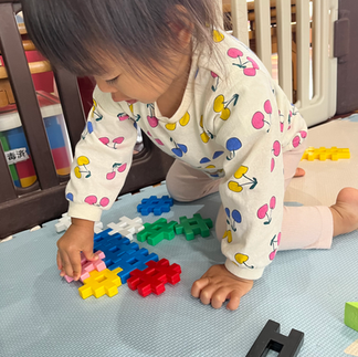 朝の自由遊びでは、二種類のブロックで遊びました。