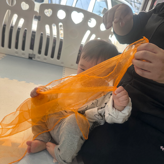 お歌に合わせて、体を触ったり、シフォン布を使って過ごしました。
